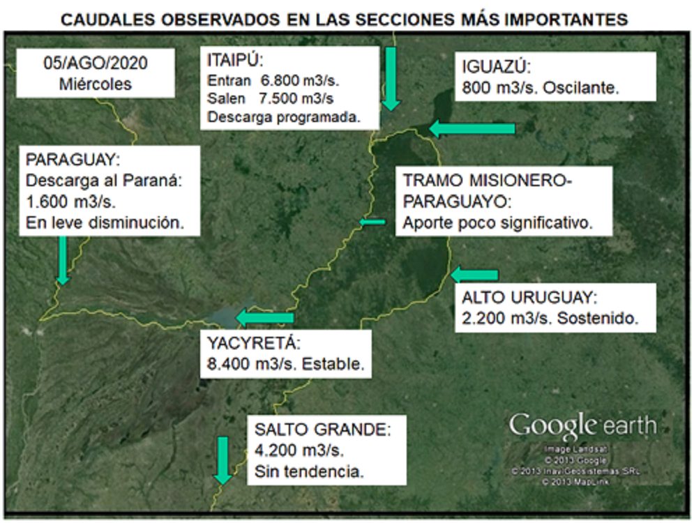 En la confluencia de los ríos Paraná-Iguazú se observó un comportamiento descendente hasta el 2 de agosto alcanzando un caudal mínimo próximo a 7.200 metros cúbicos por segundo, desde entonces se observa un comportamiento ascendente leve, hoy el caudal se encuentra en torno a 8.300 metros cúbicos por segundo, es probable que continúe oscilando en estos valores los próximos días, de igual modo se mantiene muy por debajo de lo normal e inferior al promedio de los caudales mínimos de los últimos 38 años.