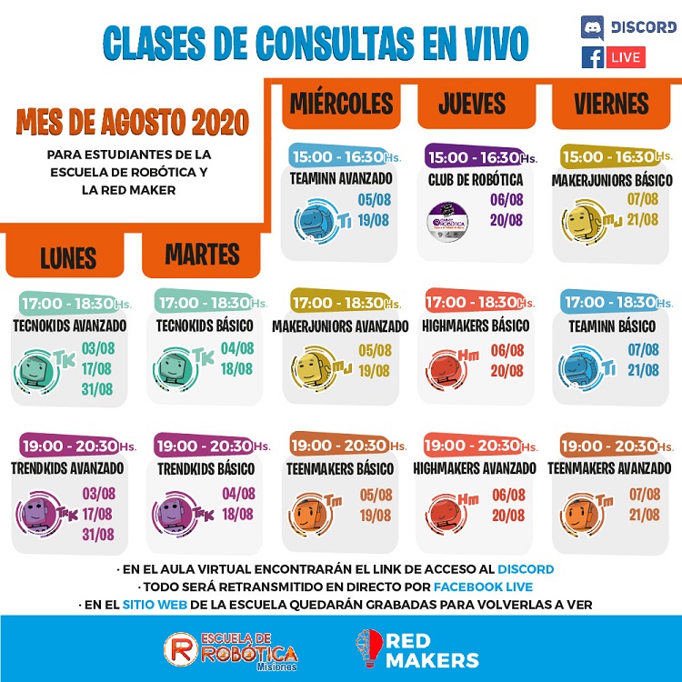 Tras el receso invernal  escolar y el debido descanso para los estudiantes, la Escuela de Robótica de Misiones retoma con las clases para todos los estudiantes de los trayectos, que continuarán asistiendo a clase de forma virtual: a través de la plataforma Discord, para las clases de consulta en vivo y a través de la plataforma El facilitador Online, desde donde podrán tener acceso cada semana a nuevos contenidos y recursos.