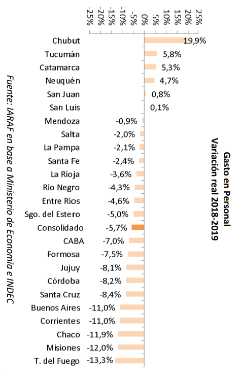 Una de las partidas más importantes a nivel provincial es el gasto en Personal. En 2019 representó el 46% del gasto primario y tuvo una variación real negativa del 5,7%.