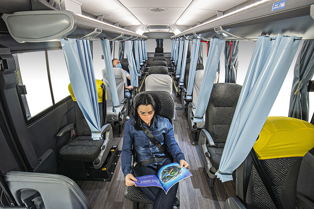 Para garantizar el distanciamiento entre los pasajeros, Biosafe tiene tres filas con un sillón, en lugar de las dos filas con dos lugares cada uno. En total son 33 asientos y servicio ejecutivo, además cada unidad cuenta con desinfección de aire.