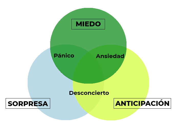 Como ilustramos en el cuadro, el miedo está relacionado con el nivel de certidumbre o incertidumbre; es decir, el miedo combinado con la anticipación nos provocará ansiedad, mientras que si está combinado con la sorpresa, tendremos una respuesta de pánico.