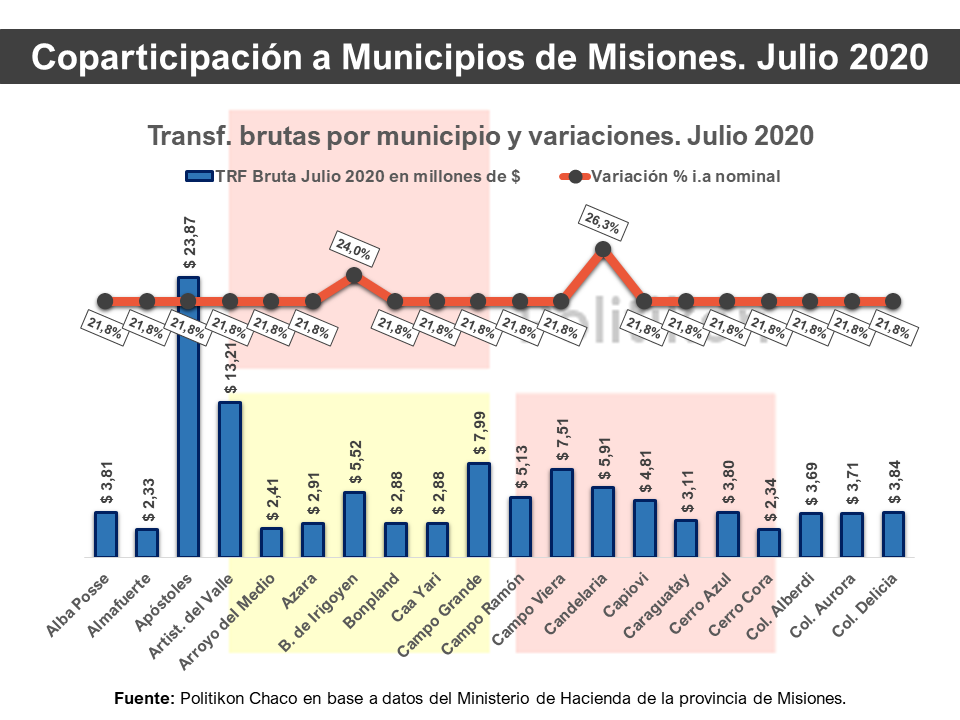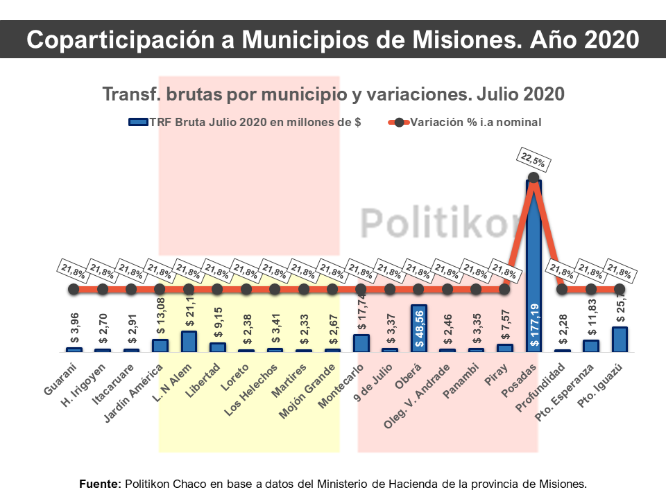 Respecto a las variaciones interanuales de julio, hubo 63 municipios que tuvieron un incremento del 21,8%; mientras que otros han tenido mayores incrementos, como ser Comandante Andresito (+32,8%), Garupá (+28,7%), El Soberbio (26,3%), Candelaria (+26,3%) y Dos de Mayo (+25,2%), entre otros. Hay que destacar en este caso, que todos los mencionados anteriores cuentan con adicionales establecidos por ley, y ello explica un mayor incremento que el resto de las comunas.