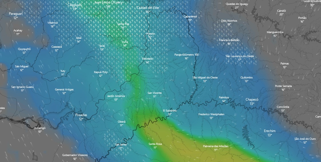 Sobre el área de cobertura de Misiones y el Norte de Corrientes se registran lluvias y tormentas de variada intensidad, algunas pueden ser localmente fuertes, con abundante caída de agua en cortos periodos, fuerte actividad eléctrica, ocasional caída de granizo y ráfagas.