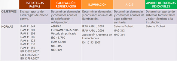 El objetivo del estudio de la IRAM 11900 es la unificación a nivel nacional de los criterios de evaluación y calificación energética de viviendas para la aplicación de políticas públicas de ahorro de energía. Todavía de cumplimiento no obligatorio, invita a las provincia a y municipio establecer límites de consumo eléctricos anuales y emisión de dióxido de carbono, el Índice de Prestaciones energéticas PE 𝑘𝑊ℎ/𝑚2𝑎ñ𝑜 y Emisión de Dióxido de Carbono por consumo energético 𝑘𝑔CO2/𝑚2𝑎ño, según el consumo según sus zonas climáticas. Cuantificar el nivel de eficiencia energética de un inmueble.