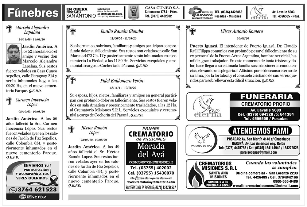 Fúnebres del miércoles 12 de agosto de 2020