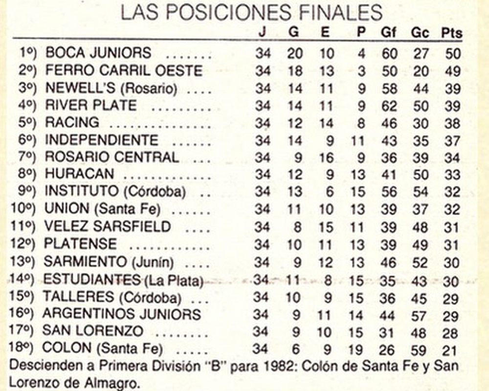Así, el conjunto azulgrana se fue a la Primera B por primera vez en el profesionalismo, dentro de una dramática última fecha, que tuvo ocho encuentros disputados en forma simultánea. Es que mientras el Ciclón luchaba por seguir en la máxima categoría con Argentinos, Boca celebró el campeonato ante Ferro, aquel recordado título por haber sido el único de Diego Armando Maradona en el Xeneize, con el recientemente fallecido Silvio Marzolini como DT.