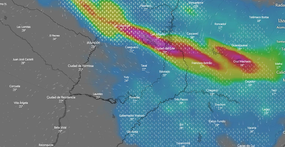 Además advierte que las mismas podrán intensificarse a partir de la tarde de este martes, pudiendo ser algunas localmente fuertes con abundante caída de agua en cortos períodos, importante actividad eléctrica, ráfagas y ocasional caída de granizo.