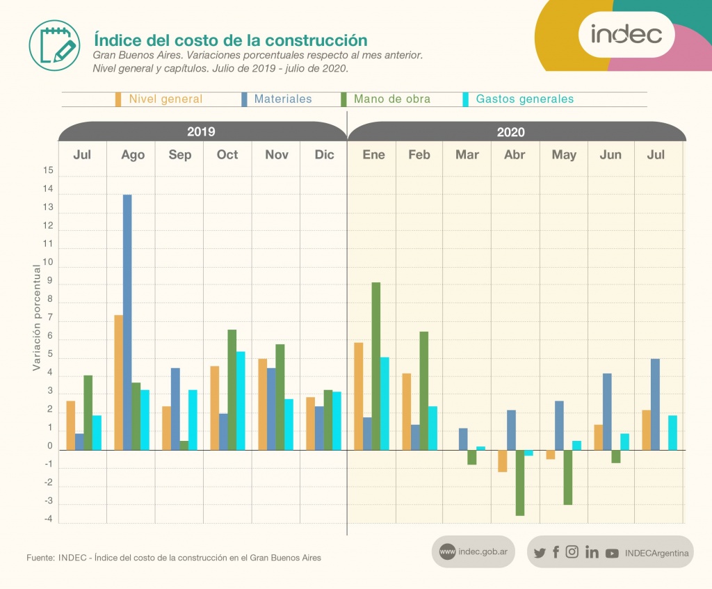 Por el lado de la construcción, el aumento de julio, levemente por encima del alza de la inflación del 1,9%, fue resultado de los incrementos del 5% en el capítulo “Materiales” y del 1,9% en el de “Gastos generales”, mientras que el de “Mano de obra”, no registró variación.
