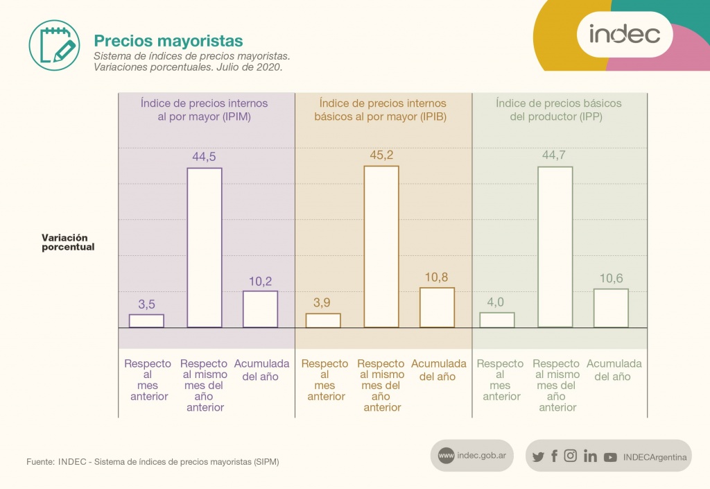 De esta forma, con la difusión de los datos a nivel mayorista y en la construcción, el Indec completó la información de índices relacionados con la evolución de los precios, que comenzó la semana pasada con la variación del costo de vida que fue del 1,9% en julio, 15,8 en lo que va del año, y 42,4% en los últimos doce meses.