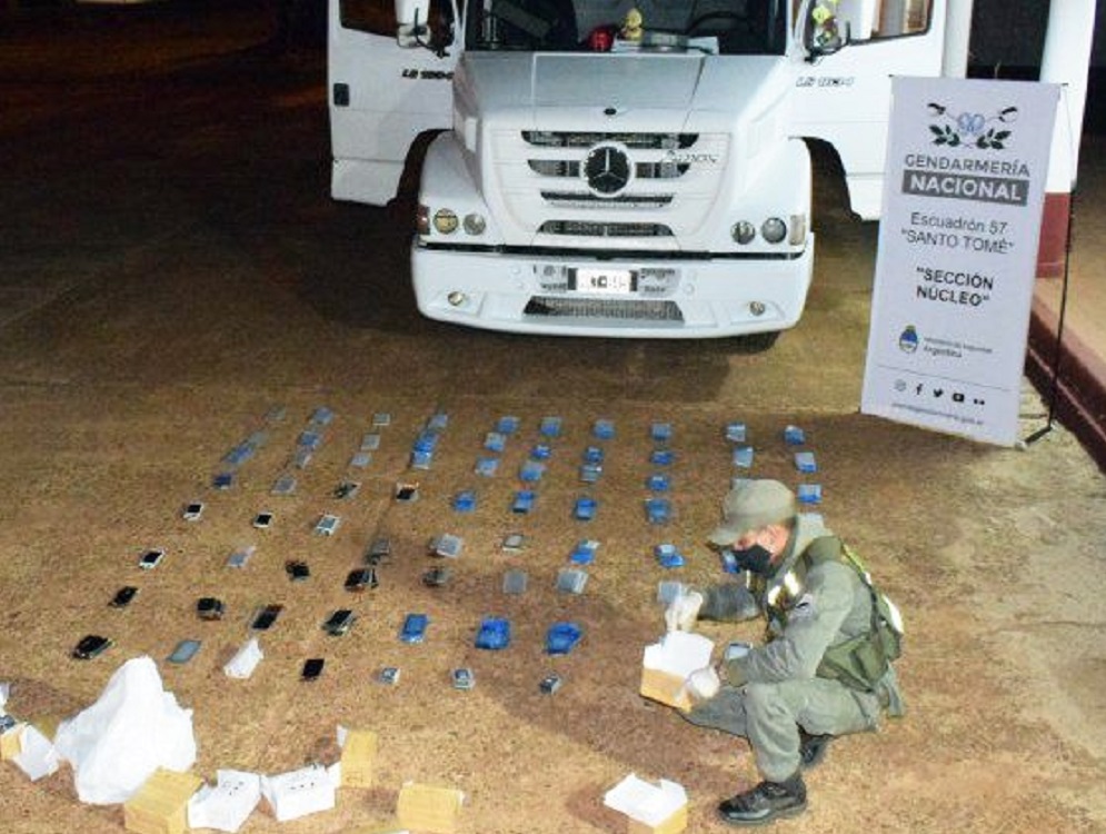 Al inspeccionar el interior de la cabina del vehículo, los gendarmes detectaron en el área del dormitorio, dos bolsas de nylon que ocultaban 21 cajas con accesorios de telefonía celular (pantallas, módulos y baterías).