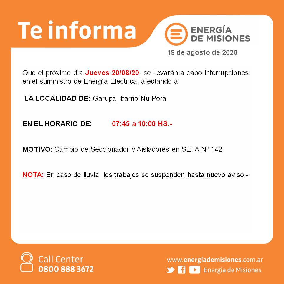 Energía de Misiones (Emsa) informó que mañana jueves se harán trabajos de mantenimiento en el barrio Ñu Porá de Garupá, por lo que el servicio estará interrumpido algunas horas, entre las 7.45 y 10 de la mañana. El motivo es el cambio de seleccionador y aisladores.
