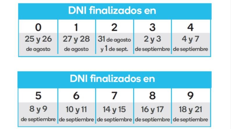 Comenzarán el próximo martes 25 de agosto y se extenderán hasta el 21 de septiembre, inclusive. El primer día arrancará con los Documentos Nacional de Identidad (DNI), terminados en 0.