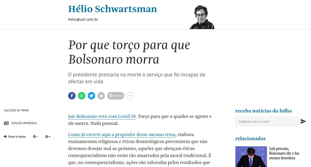 La indagación se abrió a solicitud del ministro de Justicia, André Mendonça, y se refiere al artículo de Schwartsman que, bajo el título “Por qué espero que muera Bolsonaro”, fue publicado por el diario Folha de Sao Paulo el 7 de julio, según el sitio web G1, de la cadena periodística Globo.
