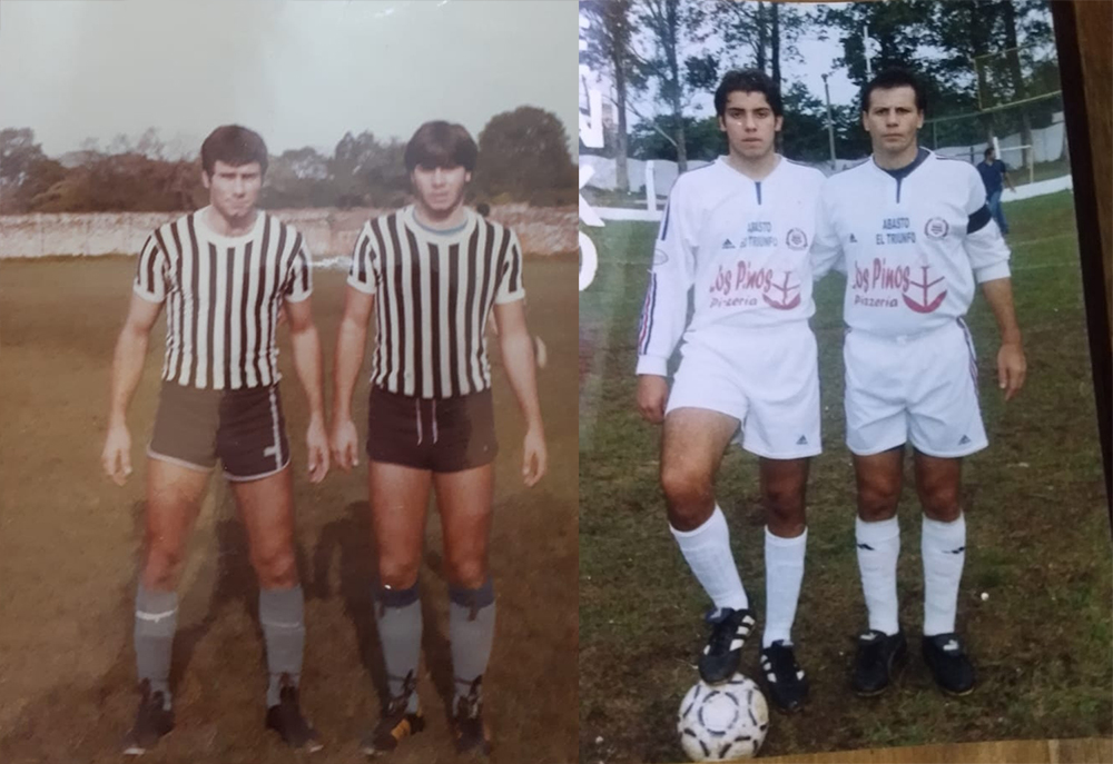 A la derecha, cuando “Benco” compartió equipo con su hermano “Puma” en el extinto Deportivo Unión de Posadas. A la izquierda, “Benco” Horrisberger junto a su hijo Pablo, con quien compartió equipo en Ciclón Misionero.