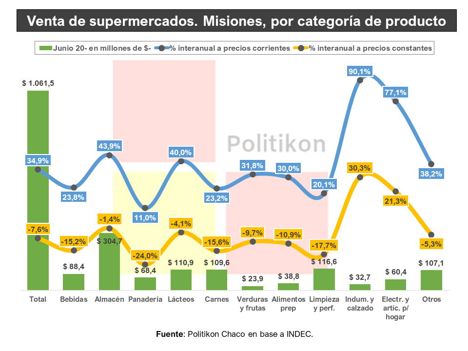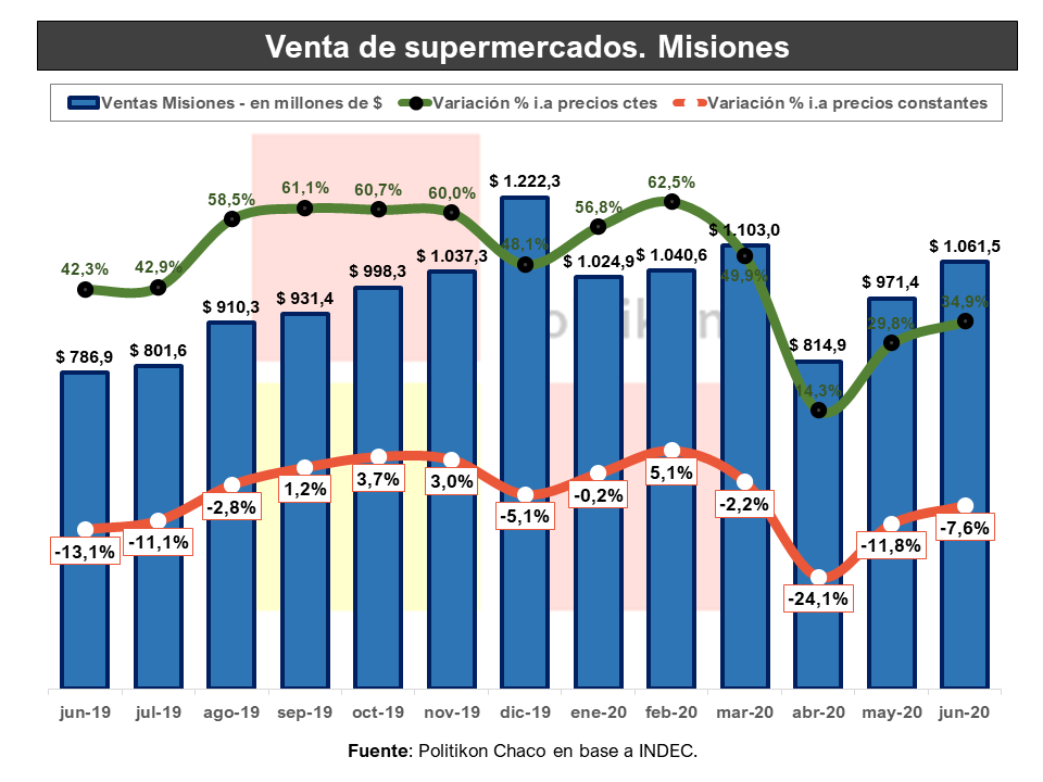La provincia de Misiones, durante junio de 2020, experimentó un nuevo descenso en las ventas en supermercados medidas en términos reales, que fue del 7,6%, siendo el segundo más alto de la región del NEA y el tercero más grande del país. De esta forma, la provincia acumula cuatro meses consecutivos de caídas reales, según un informe publicado por la consultora Politikon Chaco, en base a datos del INDEC.