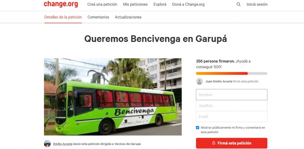Mediante el sitio Change.org un usuario identificado como Emilio Acosta inicio hoy martes un pedido para juntar firmas por la llegada de la empresa Bencivenga a Garupá. Hoy, por la implementación del Sistema Integrado de Transporte que maneja la subsecretaría a cargo de René Kegler, eso no podría ocurrir, salvo que el propio municipio le otorgue un servicio urbano.