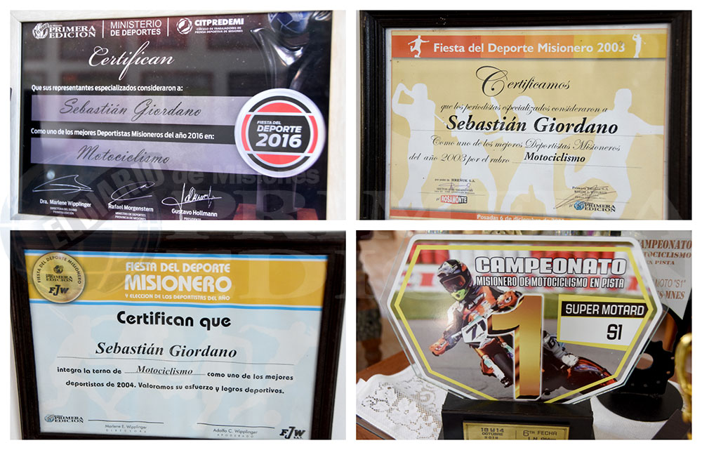 Sebastián “Pipo” Giordano siempre miró a los trofeos obtenidos a lo largo de los 25 años de carrera como meros premios, pero ahora que, con la ayuda de su familia logró reunir a todos en una especie de museo, los observa de otra manera: “recién ahora me estoy dando cuenta que detrás de cada uno de esos objetos hay una preparación, una planificación, un viaje, numerosos recuerdos”, dijo el motociclista que, por el momento, está un poco retirado de la actividad pero asegura no haber “colado los guantes”. En esa “sala de recuerdos”, acondicionada en su casa paterna, atesora alrededor de 170 reconocimientos, entre ellos, los otorgados por el Diario PRIMERA EDICIÓN y la Fiesta del Deporte Misionero (FDM), en 2003 y 2004, como Mejor Motociclista de Misiones.