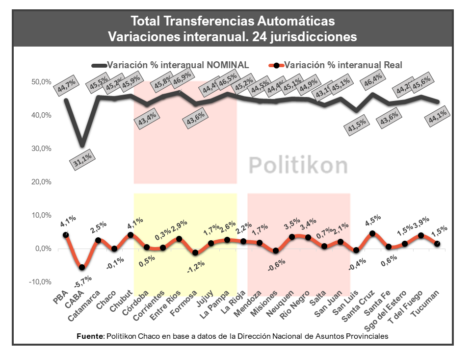 De esta forma, la tasa de crecimiento nominal quedó a tiro de la inflación, que las proyecciones indican será del 45,3% a agosto para la región del NEA. Si se deflacta el crecimiento nominal por el IPC, se observa entonces una caída real del 0,6%, por lo cual se puede considerar técnicamente, en base a los márgenes de error estimados en dicho ajuste, que los recursos podrían llegar a empardar a la inflación en este mes, según un informe de la consultora Politikon Chaco.