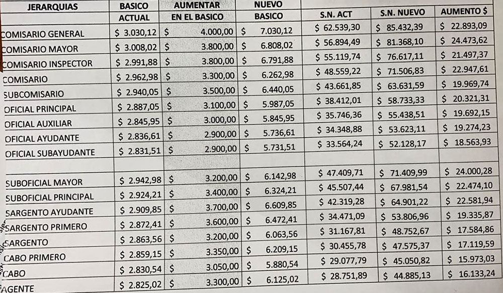 En la categoría más baja, el incremento será de $16.133 para un agente, mientras que un comisario General tendrá $22.893 se aumento.
