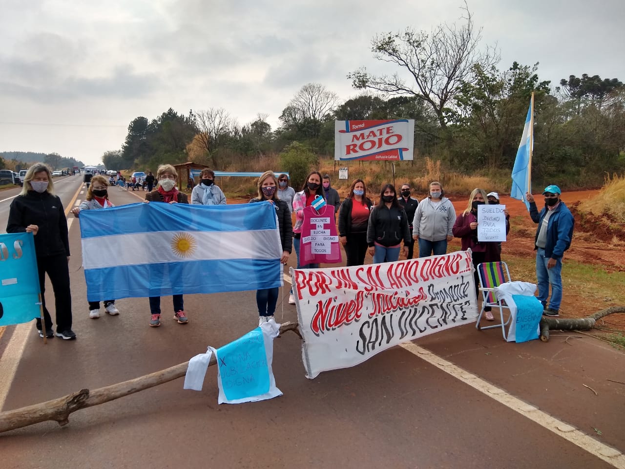 Docentes autoconvocados y enfermeros cortan la ruta 14 en el kilómetro 1250, antes de la rotonda de acceso Sur a la ciudad de San Vicente.