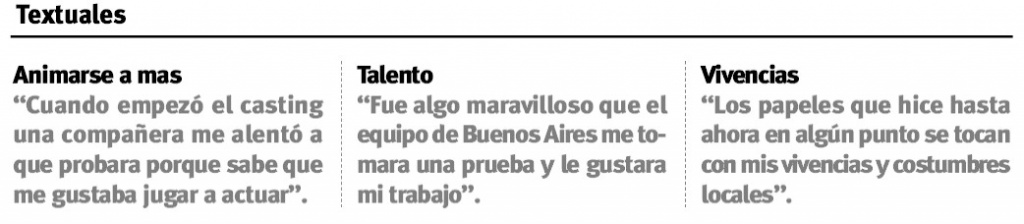 Cuenta que aunque nunca imaginó ser actriz, algo se despertó en ella al actuar y quiere seguir. “Sé que tengo que estudiar y capacitarme. Los papeles que hice hasta ahora en algún punto se tocan con mis vivencias y costumbres locales; son historias cercanas o conocidas que se asemejan; partes de mi historia como mujer y desde ahí interpreté con humildad a Gladys, que viaja desde Misiones a la capital con una historia de sufrimiento y exclusión”. Algo muy parecido a su propia realidad.