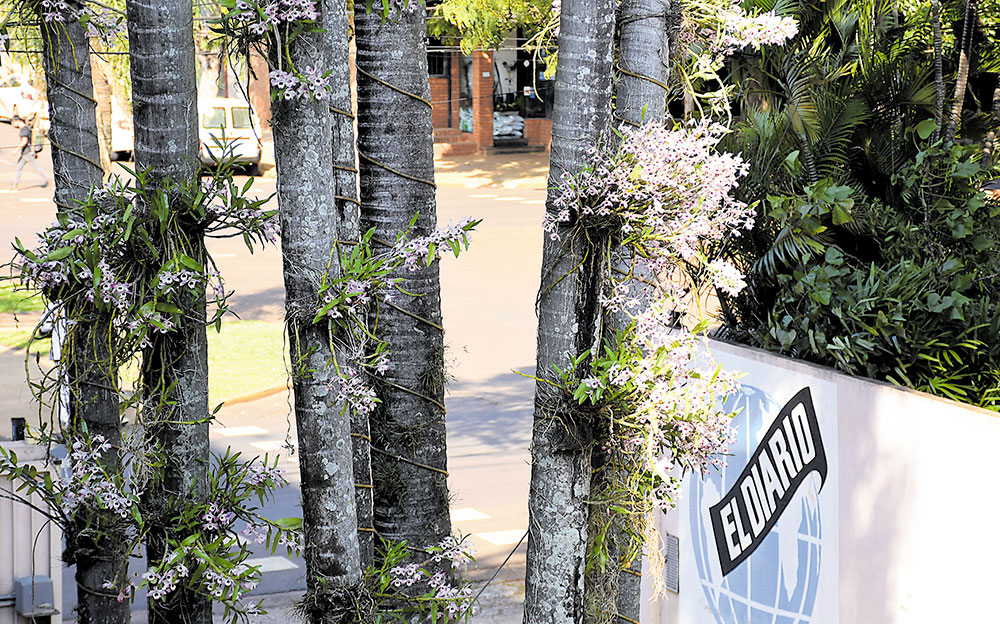 Todo el que visita las instalaciones de PRIMERA EDICIÓN queda sorprendido por la exuberancia de las orquídeas que la Asociación Posadeña plantó hace seis años en las palmeras del estacionamiento. Fernández Díaz detalló que “son dendrobium nobile, una especie introducida hace mucho tiempo en América desde Asia, que florece muchísimo cuando les tocan días de frío y mucha iluminación a la vez (justamente el nombre viene de la nobleza de tolerar estos extremos) y viene a resaltar que nosotros tenemos unas condiciones climáticas un tanto distintas al lugar de origen de donde ellas vienen, pero se vieron favorecidas y por eso es que se las ha podido cultivar en toda América, sobre todo subtropical y tropical. Las personas vienen a Misiones y las ven tan florecidas que hasta llegan a creer que son nativas”, aseguró.