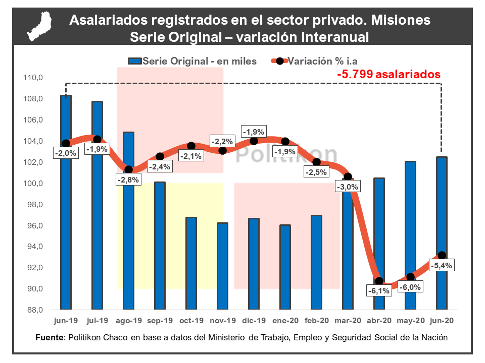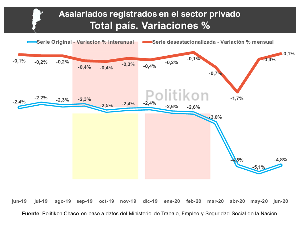 Cabe mencionar que estas cifras se desprenden de un informe realizado por la Consultora Politikon Chaco en base a datos oficiales del Ministerio de Trabajo, Empleo y Seguridad Social de la Nación, sobre la situación del empleo privado registrado para el mes de junio 2020.