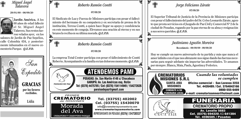 Fúnebres del miércoles 9 de Septiembre de 2020