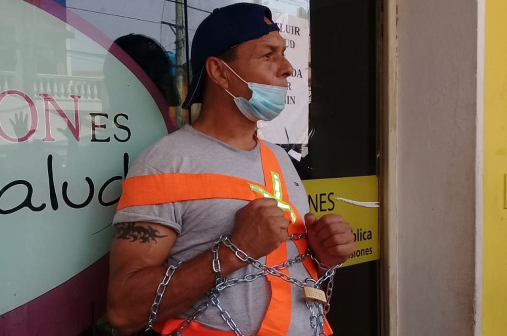 La medida de fuerza continúa este jueves y uno de los manifestantes se encadenó a la puerta de dicho Ministerio .