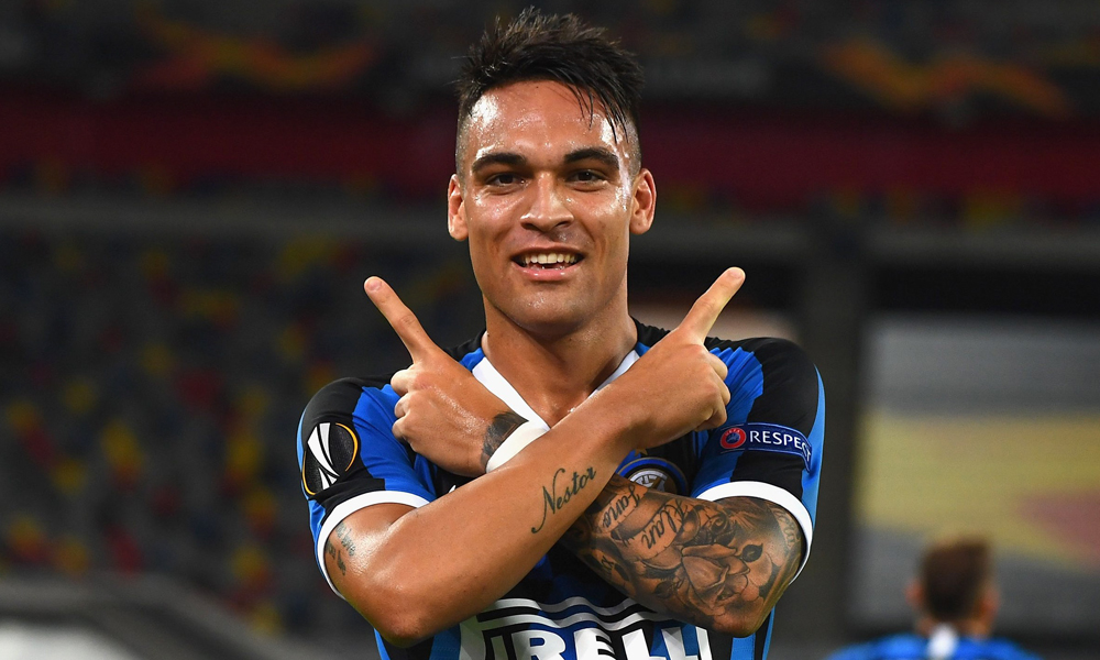 zzzznacd2NOTICIAS ARGENTINAS BAIRES, AGOSTO 17: El delantero Lautaro Martinez festeja el gol con el que el Inter se pone en ventaja ante el Shakhtar Donetsk de Ucrania en una de las semifinales de la Europa League. Foto NA: @EuropaLeaguezzzz