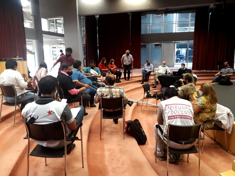 Dirigentes de los autoconvocados, UDNAM, UTEM, ATE Educación, MPL, Corriente Conti Santoro y Tribuna Docente se reunieron en el Centro del Conocimiento con el presidente del CGE, Alberto Galarza; el ministro de Hacienda Adolfo Safrán y el diputado nacional Ricardo Wellbach.