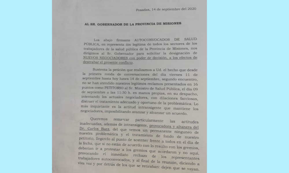 Durante la mañana de este martes los trabajadores autoconvocados presentaron el petitorio redactado en conjunto en asamblea donde estipulan los puntos en reclamo de recomposición salarial. En tanto, adjuntaron una nota con quejas respecto a uno de los funcionarios que estuvo presente en la Mesa de Diálogo y solicitaron al gobernador que se llegue a un acuerdo a la brevedad. De momento, continúa el acampe frente al Ministerio de Salud Pública.