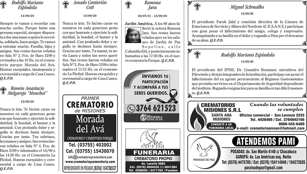 Fúnebres del Miércoles 16 de Septiembre de 2020