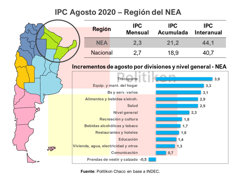 Durante agosto del 2020, la división que tuvo el incremento de precios más alto del NEA fue “Transporte”, con un alza del 3,9%, seguida de “Equipamiento y mantenimiento del hogar” con el 3,3% y “Bienes y servicios varios” con 3,1%”. En cuarto lugar, se posicionó “Alimentos y bebidas no alcohólicas” con un alza del 2,9%, mayor a nivel general.