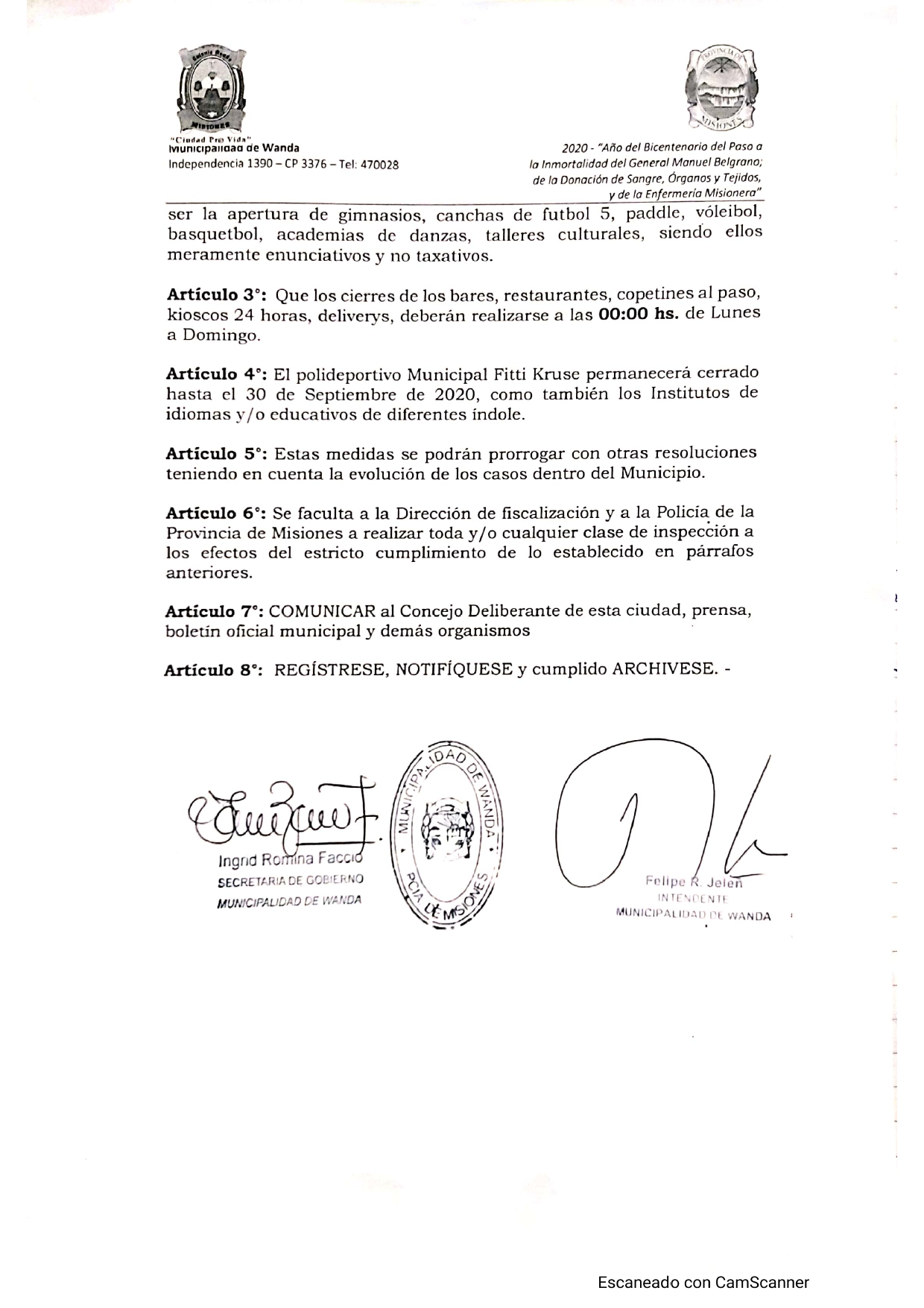 Ante la aparición de casos positivos de coronavirus en Colonia Wanda, el intendente Felipe Jeleñ resolvió la suspensión hasta el 30 de septiembre de todas las actividades que no sean consideradas esenciales, además de reiterar las medidas de prevención y los protocolos vigentes para el resto de los rubros que podrán seguir funcionando.