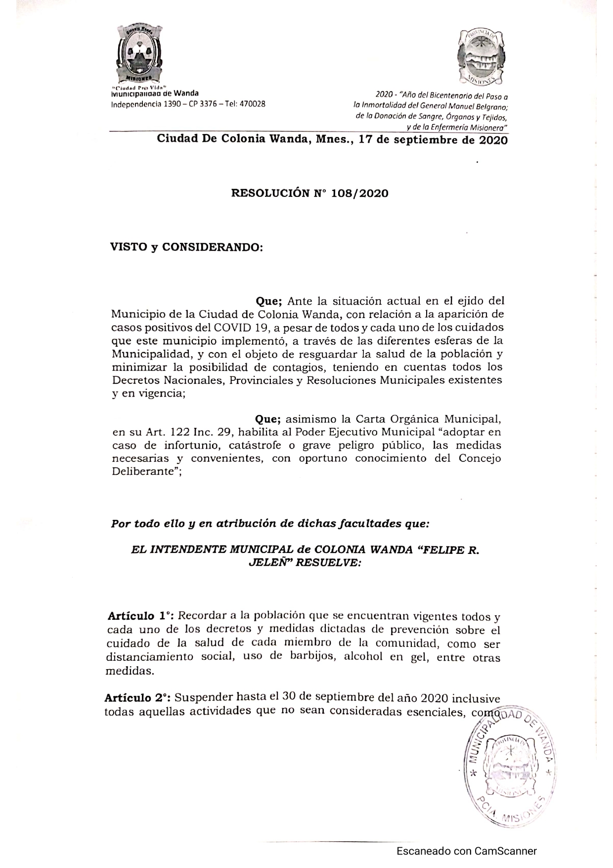 Ante la aparición de casos positivos de coronavirus en Colonia Wanda, el intendente Felipe Jeleñ resolvió la suspensión hasta el 30 de septiembre de todas las actividades que no sean consideradas esenciales, además de reiterar las medidas de prevención y los protocolos vigentes para el resto de los rubros que podrán seguir funcionando.
