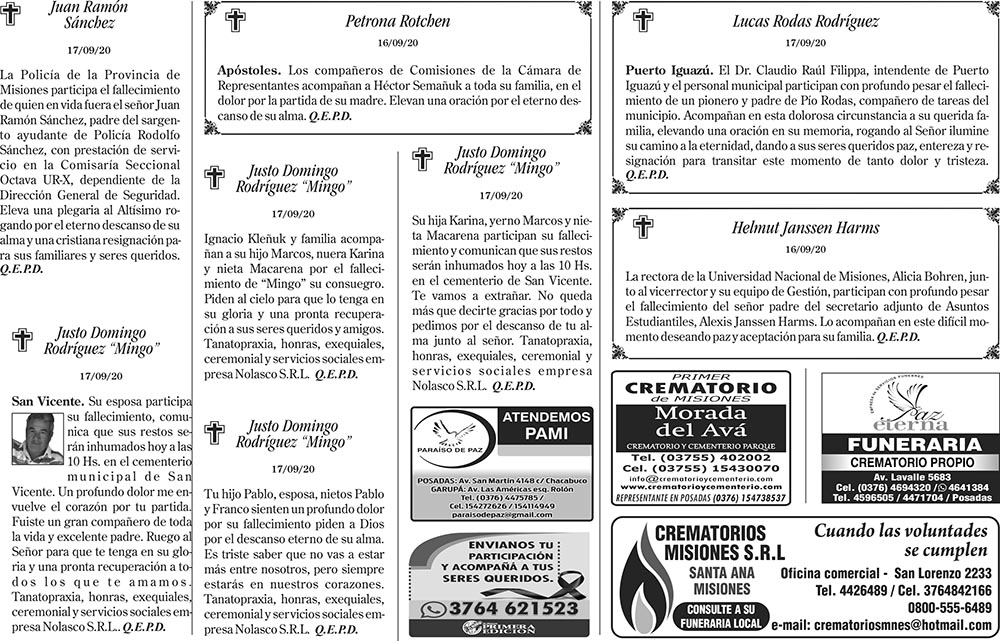 Fúnebres del Viernes 18 de Septiembre de 2020