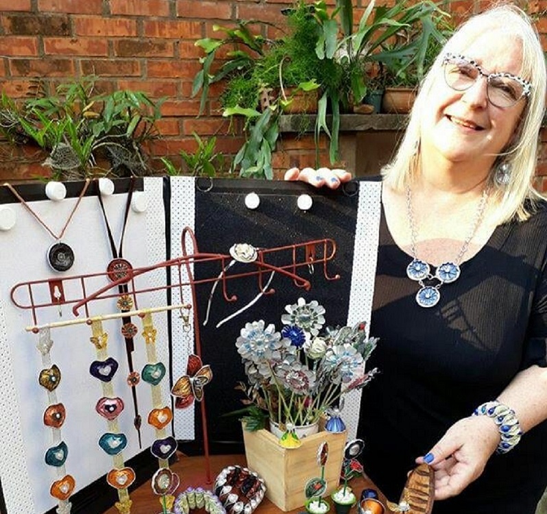 Su profesión siempre la llevó a trabajar con las manos, usar tijeras y plasticola, ahora con esas mismas herramientas básicas crea dijes, aros, pulseras, llamadores, jardines colgantes, centros de mesa, pesebres, brujitas, angelitos y hasta lo no creado está por surgir.