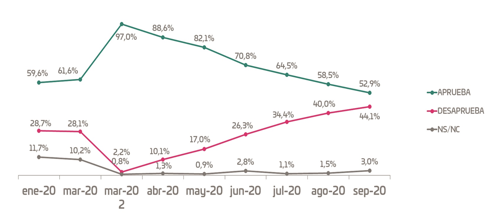 En ese sentido “la aprobación de gestión es una variable de apoyos o consensos que logra el Gobierno. El 52,9% de los consultados lo apoya, aunque en la línea histórica viene cayendo constantemente 5 puntos desde hace cuatro meses su nivel de aprobación. Había subido al inicio de la pandemia, cuando se había mostrado como un Gobierno que gestionaba y controlaba la agenda pública en la temática. Hoy por hoy en diferentes temas, no sólo los referidos a la pandemia sino en otros de la economía, van socavando la imagen al no estar manejando la agenda. Hoy es un Gobierno que no logra explicar o argumentar a los votantes temas como Vicentín o la reforma judicial”, explicó Bertone.
