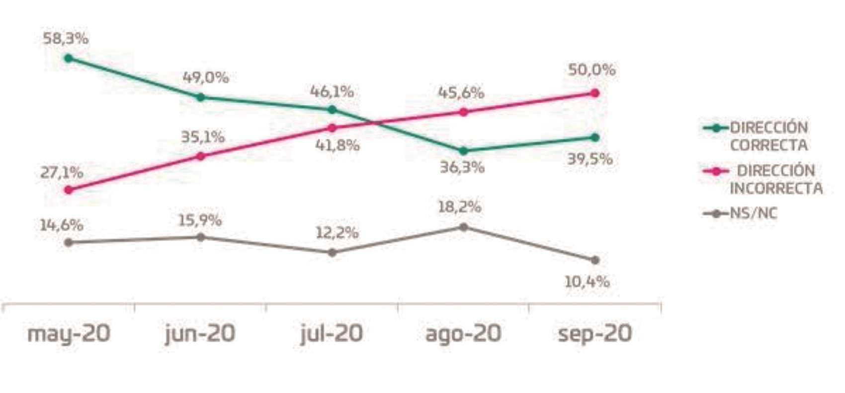 Respecto al camino correcto o incorrecto del Gobierno, en mayo un 58,3% decía que iba bien hasta bajar al 39,5% de septiembre. En la vereda opuesta, los que consideran que Argentina va por el camino equivocado pasaron del 27,1% en mayo al 50% de septiembre.
