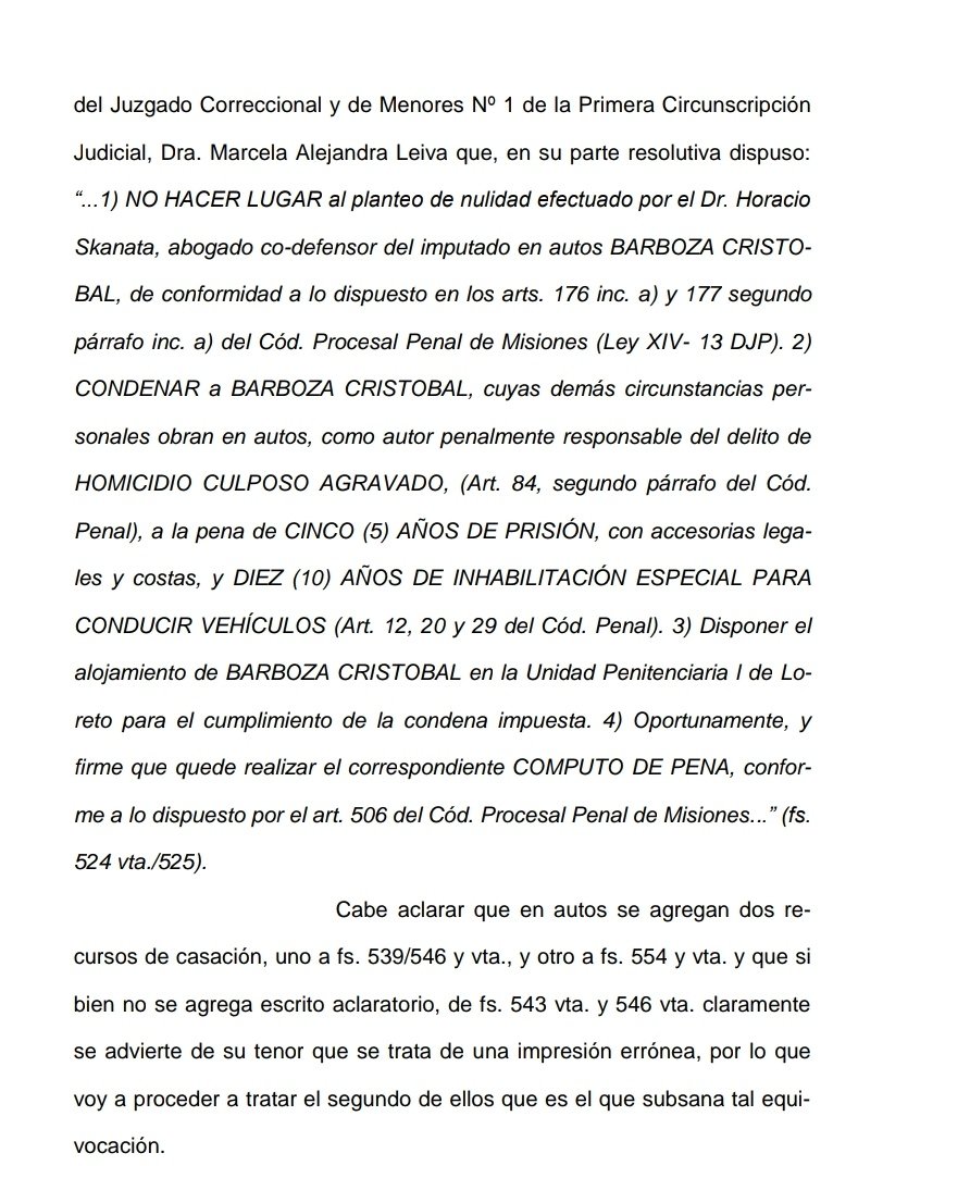 Al voto del juez Cristian Marcelo Benítez adhirieron los ocho ministros restantes, y en el fallo se destacó, entre fundamentos y voces de periciales, que “la mecánica y causa eficiente del accidente fue que Cristóbal Barboza iba por el medio de la ruta (nacional 14), invadiendo el carril contrario y que el choque se produce en el medio de la calzada. Ello queda probado por la posición final en la que queda la camioneta, y además por el daño que presenta la misma en la parte central del rodado, daño causado por el motor del automotor Ford Fiesta (que conducía Andersson)”.