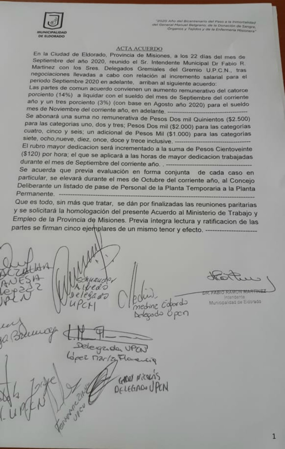 Luego de varias jornadas de reclamo por mejora salarial, los trabajadores municipales de Eldorado firmaron un acuerdo con el Ejecutivo de dicha localidad.