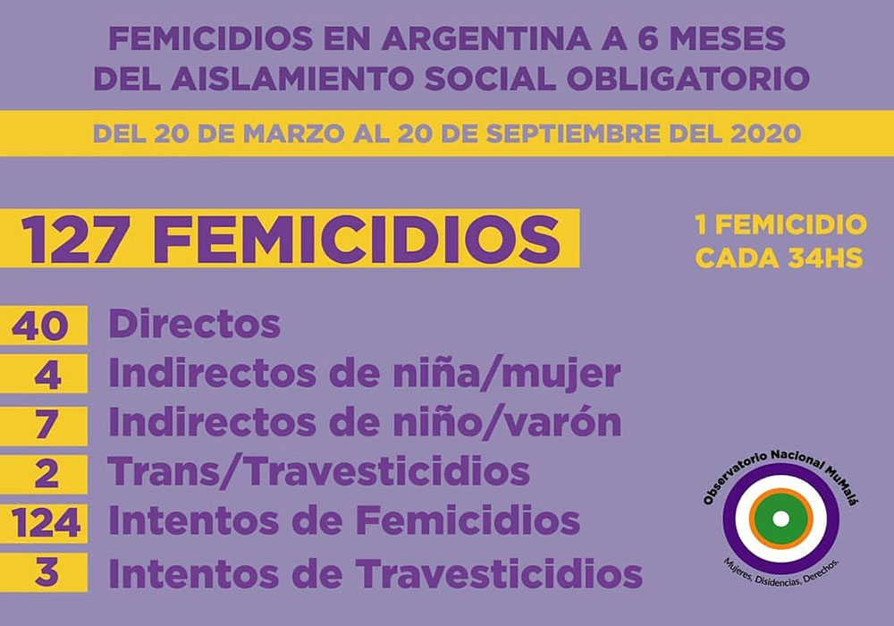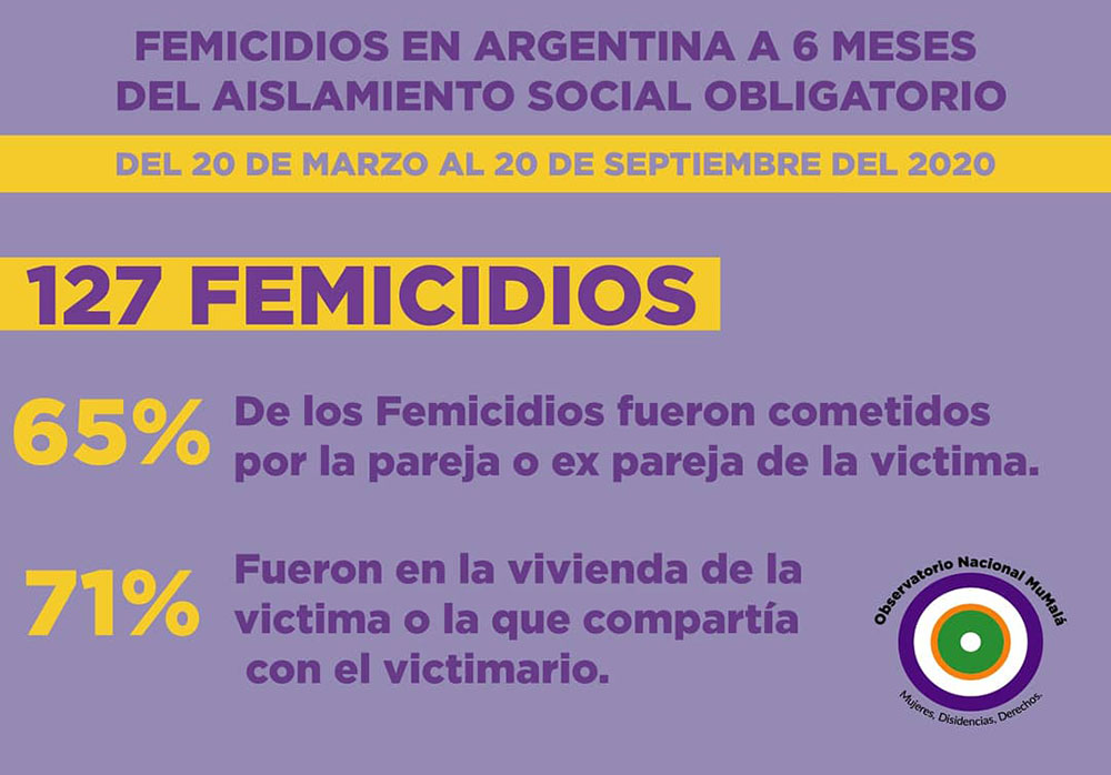 Cuando se compara la cantidad de femicidios en estos seis meses de aislamiento social respecto a los ocurridos el año pasado, no se evidencia un aumento en el número de asesinatos producto de la violencia machista: en 2019, según MuMaLa, se registraron 284 femicidios, uno cada 31 horas. Pero bajo las medidas de aislamiento social sí aumentó la saña y tortura que antecedió a los femicidios, “el dato no es menor, el 5% de las mujeres asesinadas de marzo a septiembre fueron violadas antes de morir y también se evidencia un aumento de la tortura con armas blancas”, detalló Maidana.