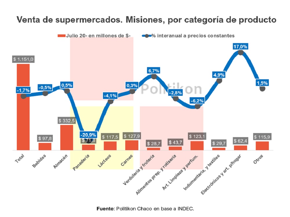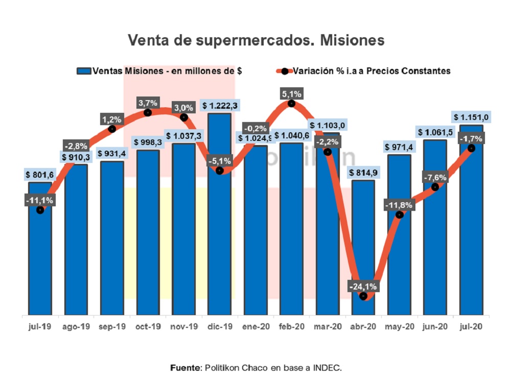 La provincia de Misiones, durante julio de 2020, experimentó una caída en las ventas en supermercados medidas en términos reales del 1,7%, siendo así el quinto mes consecutivo de caída real. Pese a ello, se destaca la importante desaceleración de la caída, siendo la menor de los últimos cinco meses, según un informe publicado por la consultora Politikon Chaco, en base a datos del INDEC.