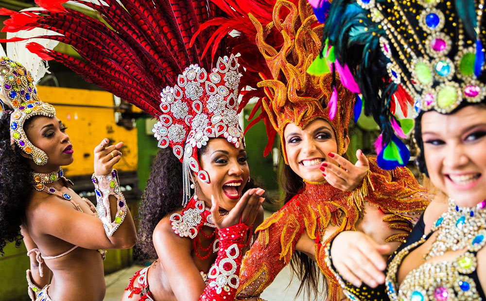 Los tradicionales y mundialmente famosos desfiles del Carnaval de Río se realizan en el icónico Sambódromo, donde las escuelas de samba integradas por cientos de personas caminan y bailan siguiendo un cuidadoso guión, que preparan a lo largo de todo el año, con ropas vistosas, al ritmo que marcan los percusionistas.