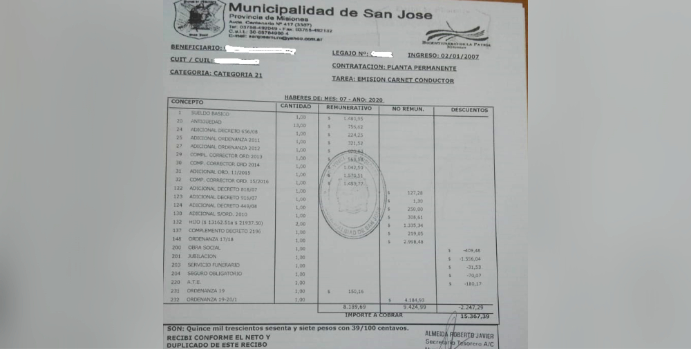 “Un empleado categoría 21, con 13 años de antigüedad tiene un básico de $1480, presentismo de $400, antigüedad de $756, etc. y con los descuentos pertinentes gana $15.367”, fue la nota enviada por Cardozo a la administración de la Municipalidad de San José.