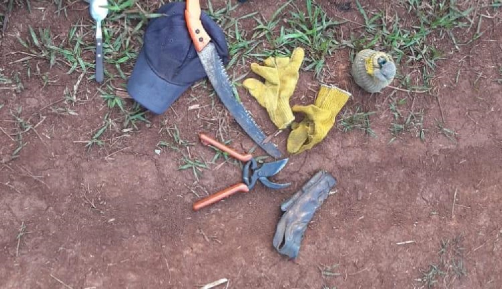 Alertados de esto, los policías de inmediato dieron inicio a una vigilancia en la zona, hasta que hoy con las primeras luces del día dos jóvenes llegaron a bordo de una moto Zanella de 110 ccc, con un serrucho y un machete, además de 5 bolsas tipo ponchadas, con presuntas intenciones de continuar cosechando la yerba de la propiedad privada.