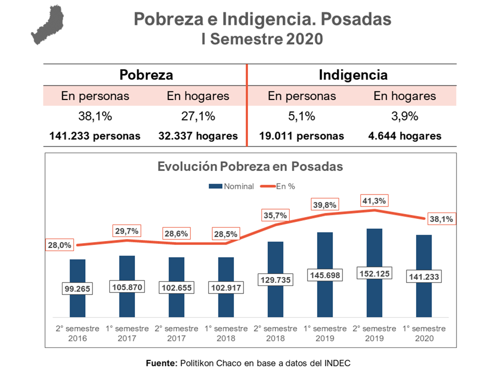 En el primer semestre del 2020, en el aglomerado urbano de Posadas se registraron 141.233 personas en situación de pobreza, y unas 19.011 en situación de indigencia, a su vez que hubo 32.337 hogares pobres y 4.644 hogares indigentes.