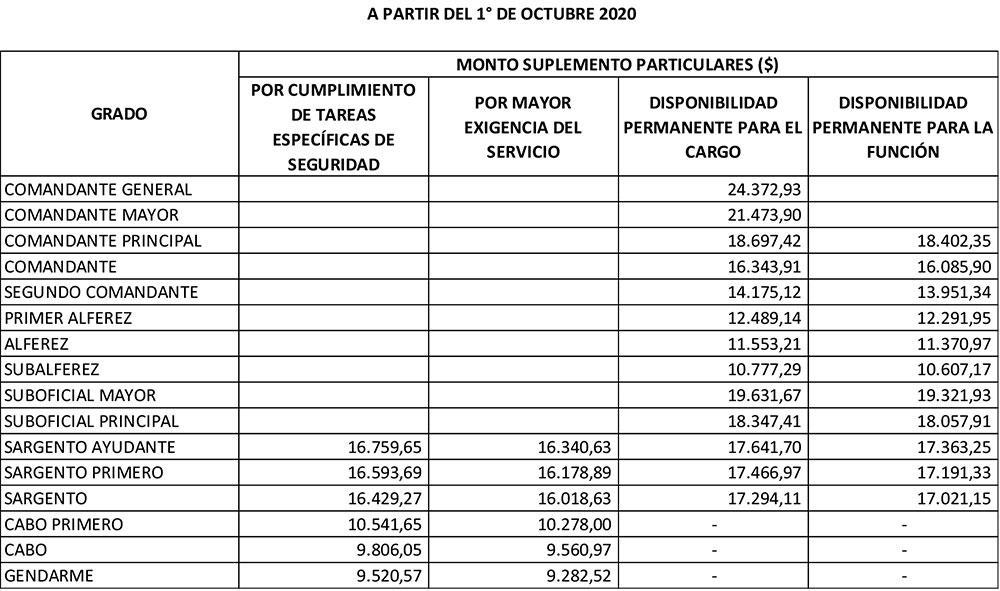 En el caso de la Gendarmería se fijan los importes correspondientes a los suplementos “por cumplimiento de tareas específicas de seguridad”, “por mayor exigencia del servicio”, “por disponibilidad permanente para el cargo” y “por disponibilidad permanente para la función”, que percibe el personal con estado militar de gendarme en actividad.
