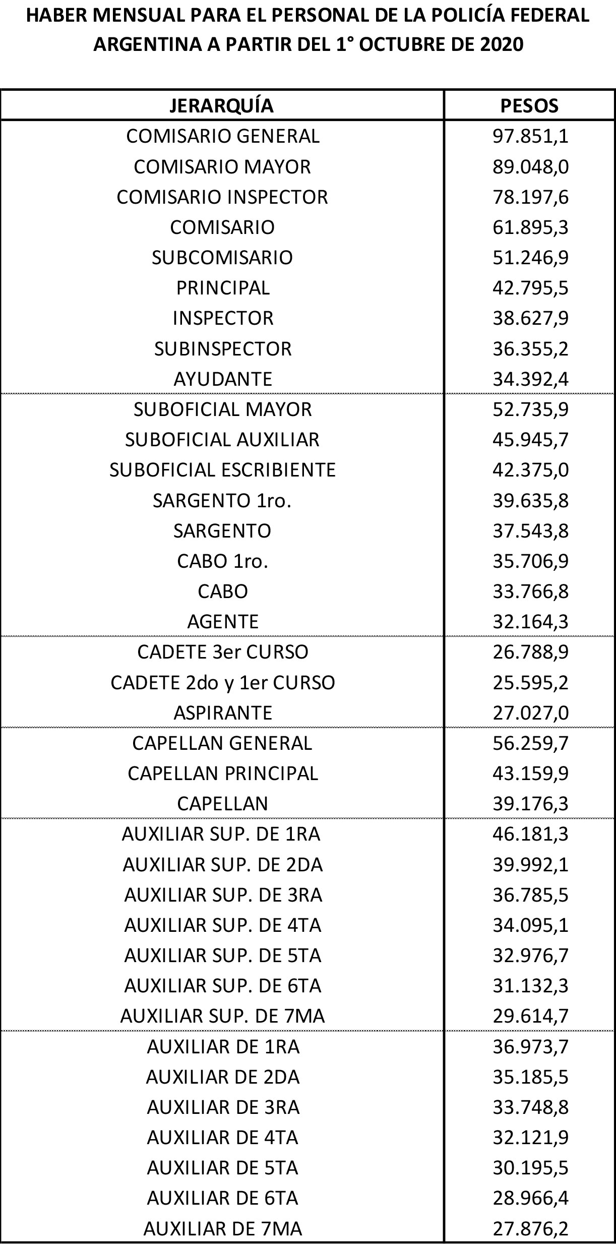 En tanto, a través de la Resolución 344/2020 del Ministerio de Seguridad publicada este jueves en el Boletín Oficial -con la firma de la ministra Sabina Frederic– se establece también a partir de ahora el nuevo haber mensual para los efectivos de la Policía Federal Argentina, Gendarmería Nacional y Prefectura Naval.